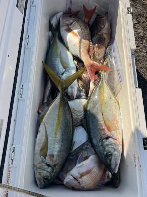 | シマアジ狙いからのオキアミ五目で出船しました‼️ 船中、シマアジ3匹、マダイ、メイチダイ、オオモンハタ、イサギなど釣れました。 |