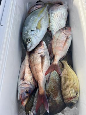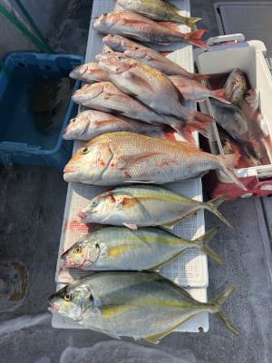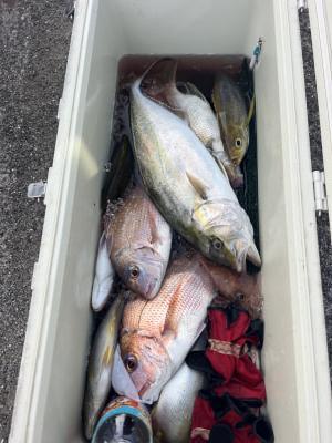 | シマアジ狙いからのオキアミ五目で出船しました‼️ 船中シマアジ46〜50cm5匹、マダイ、カンパチ、メイチダイ、イサギなど釣れました |