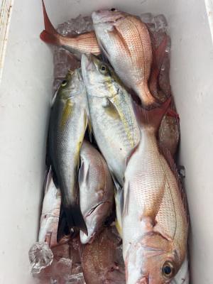 | シマアジ狙いからのオキアミ五目で出船しました‼️ 船中シマアジ 2匹、マダイ、カンパチ、メイチダイ、イサギなど釣れました。 |