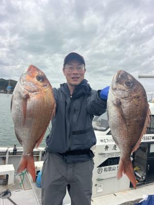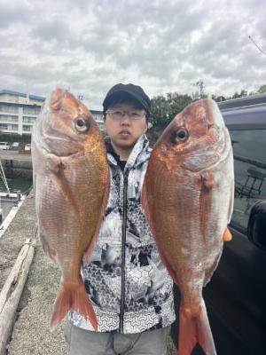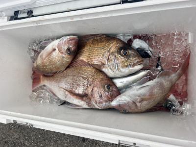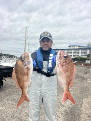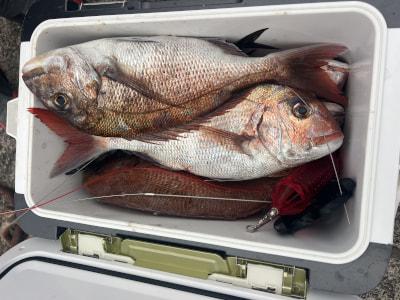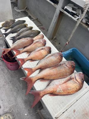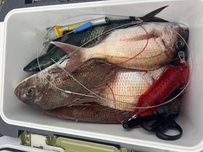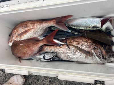 マダイ | 40〜62cm | 22匹 | 天秤ズボ、オモリ100号、ハリス4号7m | オキアミ |