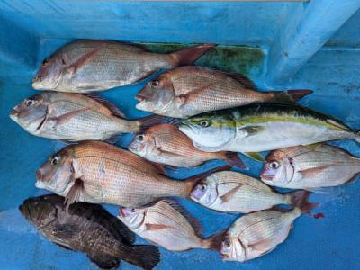 テンヤマダイに出船。マダイ0.2〜1.5キロを1〜7匹。マハタ、イナダ、カサゴ、ホウボウ、メバル、フグ混じった。低気圧のせいで波が高かったわりには外道、良型マダイともによく揚がりました。今後の予定は明日3月1日マタイ船空席多。7日土曜日マダイ船空席多。3月8日日曜日メバル船空席多…