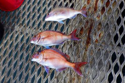 マダイ | 33〜29cm | 3匹 | ウキ(ふかせ)釣り(ハリス1.5号) | オキアミ |