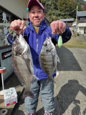 チヌ | 32〜43cm | 2匹 | ハリス2.5号 5号針 オモリ無し 竿1.58m | むきカキ |