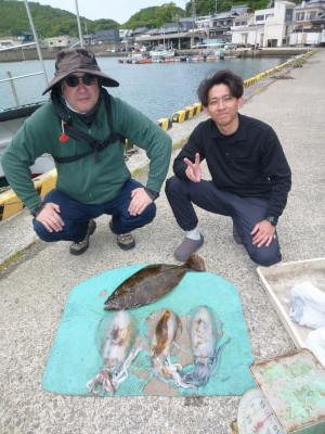 神谷一文字、アオリイカ、3杯、0,8〜1,2`、ヒラメ、1枚、53cm、ヤエン&餌木 かつらぎ町、山本さん、大阪市、宮田さん |