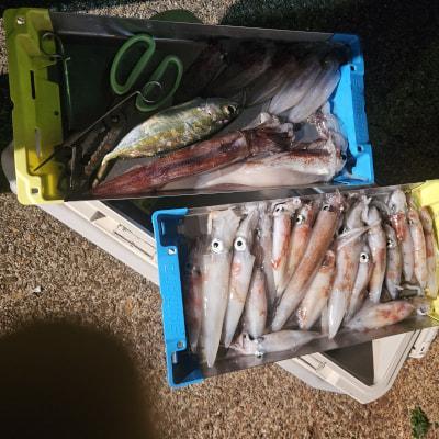 冬の今シーズン半夜便出船しました。キハダふかせ忙しく試し釣りできてなくぶっつけ本番で心配しましたが毎年来てくれるお客さん達で出撃!暗がりからポツリポツリ乗り始めケンサキ1人あたり36、25、16、15、10、5釣果にばらつきありますが何とか形になりました船中100ハイ程でした。サイズも串本にしては良かったと思います。毎日、半夜便出れませんが3名以上で予約してもらえらば出船するのでお願いします🙇