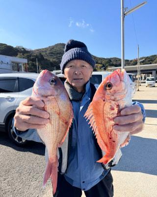 マダイ | 2匹 | 竿釣り 天秤フカセ ハリス5〜6号 4,5〜6b(3ヒロ〜4ヒロ)まで マダイ針10、11号 おもり120 オキアミ用コマセカゴ | オキアミ | ||