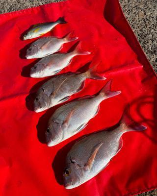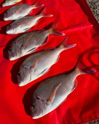 マダイ | 28〜38cm | 5匹 | 竿釣り 天秤フカセ ハリス5〜6号 4,5〜6b(3ヒロ〜4ヒロ)まで マダイ針10、11号 おもり120 オキアミ用コマセカゴ | オキアミ | |