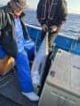 今日も潮岬でのキハダフカセ狙い 昨日のサメの入れ食いと違い キハダのアタリは3回でした 松山さん 今シーズン初挑戦でいきなり49kgゲット 畑中さん 今シーズン3本目の40,4kgと2本釣れました 途中 小型のシイラの入れ食いがありました