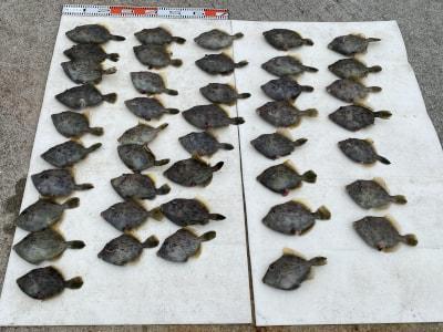 カワハギ 42匹で 割引券 2枚獲得 松岡氏の釣果 |
