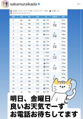 天候: 風向:特定出来ず 潮:特定できず 水温: 波高:特定出来ず