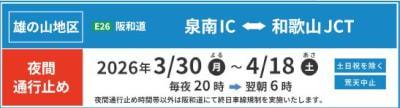 阪和道夜間通行止めのお知らせ 2026年3/30(月)20時〜4/18(土)6時※土日祝日を除く |