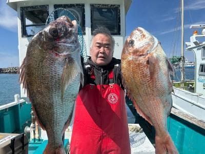 ![]() 35mポイント、マダイ32〜42センチまでを5匹釣りました😆✌️楠本様夫婦 |