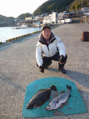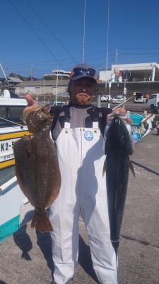 ![]() 沖一文字外、ヒラメ、1枚、60cm、ヒラスズキ、1枚、60cm、喰わせ飲ませ釣り大阪市、石田さん |