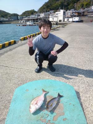 ![]() 沖一文字内、マダイ、1枚、41cm、イサギ、1枚、34cm、かご釣り紀の川市、西沢さん | ||