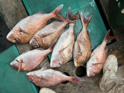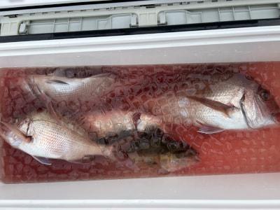 マダイ | 40〜60cm | 船内18枚 | 天秤カゴ ハリス4号5ヒロ 針8~10号鉛100号 | オキアミ |