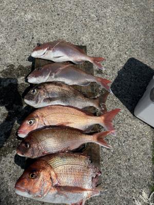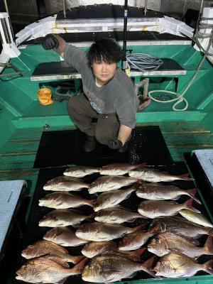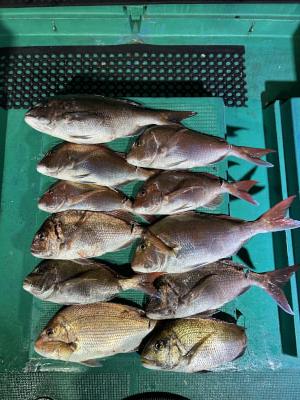 | タイ釣り午前午後出船しました。 午前便は厳しくふたりで5枚… 午後便はよく釣れて3名で32枚! よく釣れました。 |
