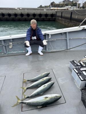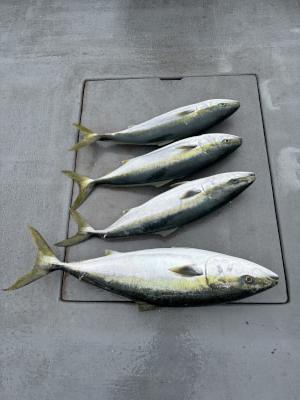 ブリ、メジロ | 4匹 | 竿釣り、落とし込み仕掛け4本針10〜12号、オモリ80 |