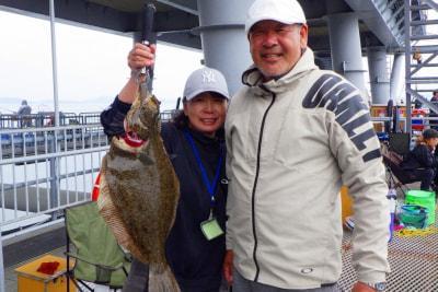 ヒラメ63aが釣れました! 展望デッキ下・大阪側 のませ釣り・アジにて 岩井様 |