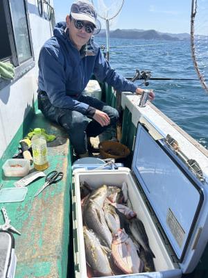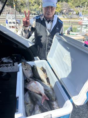 | 11日釣果 アジ、イサギ狙いです 朝から風波強くアジ釣りをやめてイサギ狙い、ぼちぼち釣れて帰る頃には皆さんよく釣ってくれました |