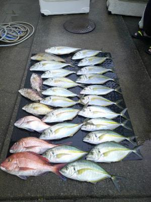 | シマアジメインで出船。今日は朝イチしばらく釣れずに少し不安でしたが、しばらくしてから時合がありました。潮も速く時間も短かったですが、何とか皆さん上手に釣ってくれました。 今日も全員ボーズ無しで良かったです。1人1〜4枚でした。 |