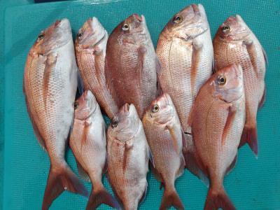 マダイ | 36〜60cm | 9匹 | 竿釣り | オキアミ |