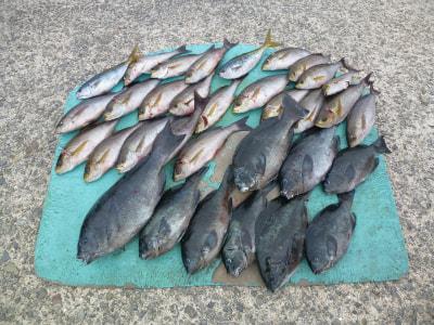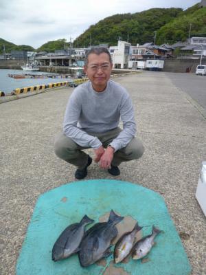 沖一文字内、グレ、2枚、30〜40cm、イサギ、2枚、30cm、かご釣り 京都市、中村さん |