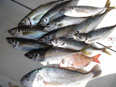マアジ | 25〜30cm | 11匹 | 胴付き3本針 | 青虫・オキアミ |