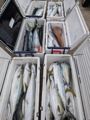 | 落とし込み釣果です!3日時化後の出船でした、今日のベイトはウルメイワシ、サバ、小アジでした、サワラが乱舞でハリス多数切れる場面もサワラ5、マダイ4、ヒラマサ1,ブリメジロ33、ハマチ5 ガシラ、レンコ鯛他ハリス16号、鉛100号使用、クッションリーダー20号2M |