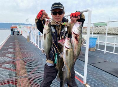 ハネ、スズキ | 42〜60cm | 4匹 | ウキ釣り 竿4.5m 針6号 ハリス2.5号 オモリ0.8号 棚3.5ヒロ | シラサエビ |