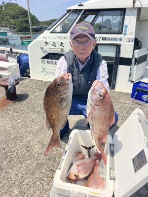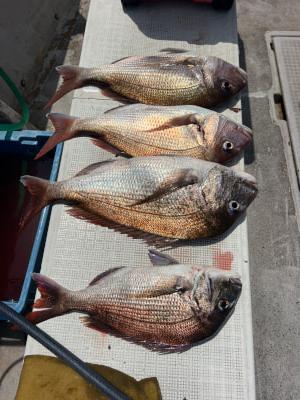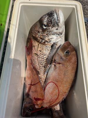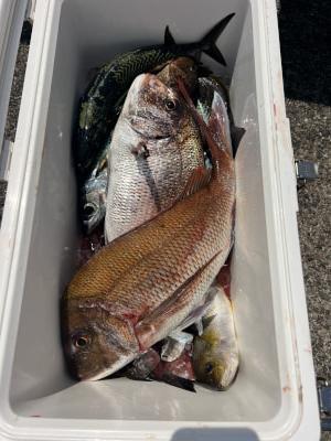 マダイ | 35〜72cm | 19匹 | 天秤ズボ、ハリス4号、オモリ100号 | オキアミ |