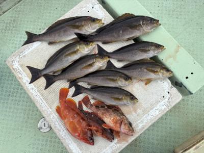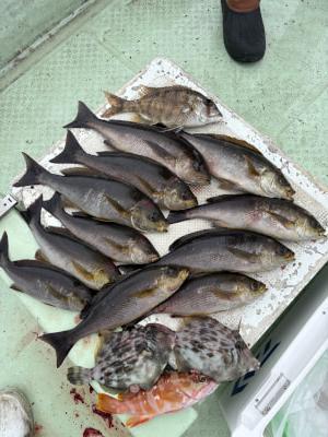 | 伝馬船釣果、久しぶりの出船でした。 良型のイサギが釣れてました。他にカワハギ、メイチ、アカハタなどが釣れてました。 |