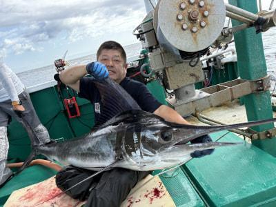 キハダフカセに出船、第三の釣果です。3ヒットでキハダ33キロ、バショウカジキ、サメ?らしきバラシ一回でした。本日もご乗船いただきありがとうございました🙇 |