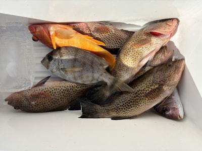 | 船外機釣果、オオモンハタ、アオハタ、アカハタ、シオ、メイチなどが釣れてました。 |