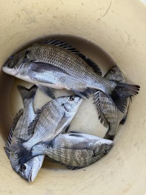 チヌ | 21〜35cm | 5匹 | 竿1,5mハリス2号チヌ針5号 | 丸貝、オキアミ |