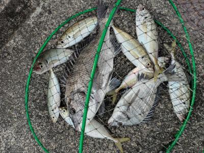チヌ | 25〜45cm | 9匹 | ハリス1.5号 3号針 オモリ無し 竿1.5m | オキアミ サナギ |