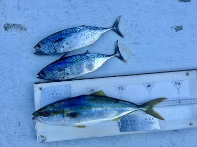 ハマチ46cm,ヤイトガツオ34,35cm 陳氏の釣果(ジグ30g) |