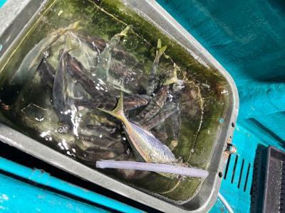 マアジ・マルアジ | 24〜30cm | 26匹 | 手釣り、天秤3本針、鉄仮面100号 | アミエビ |