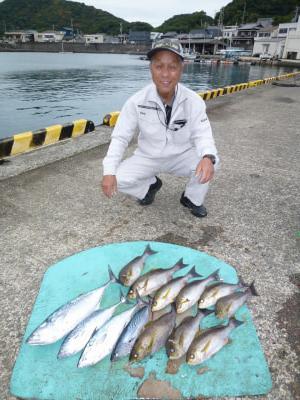 沖一文字内、ヤイトガツオ、3本、35〜36cm、イサギ、9枚、26〜32cm、かご釣り 泉南、稲田さん |