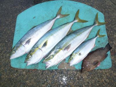 沖一文字外、メジロ、3本、70cm、オオモンハタ、1匹、40cm、ハマチ、1匹、45cm、飲ませ釣り 神戸市、西本さん |