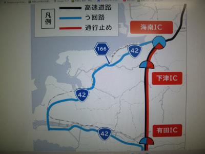 17日夜〜20日朝迄、海南湯浅道路下り夜間通行止めです。気をつけて下さい |