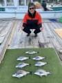 磯釣りスタイルのフカセ釣り。白浜沖でグレ釣りするなら大瀬丸へ。午後便釣行の鴨居港出船でした。昼からは曇後小雨でした。西の風で岡入れの潮に変わりましたが、松塚様ご夫婦よく頑張ってくれて寒グレ36cmを頭に10枚と良型イサギ38cmを頭に4枚と平ズマ45cmと3目釣れて良かったです。…
