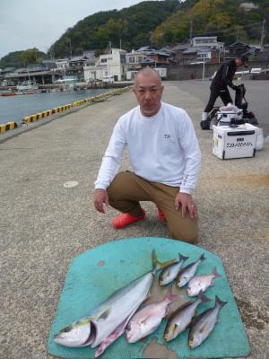 沖一文字外、メジロ、1本、72cm、マダイ、1枚、34cm、イサギ、2枚、29〜32cm、かご釣り 堺市、谷内さん |