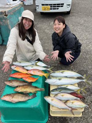 コメント:今日も落とし込み釣りに出船しました。 カンパチ、ツバス、メジロ、オオモンハタ、ホウキハタ、ヨコスジフエダイ、などなど釣れ全員安打で楽しめました。 明日は風強いので火曜日から出船します。 よろしくお願いします。