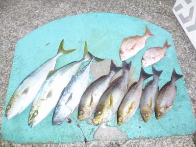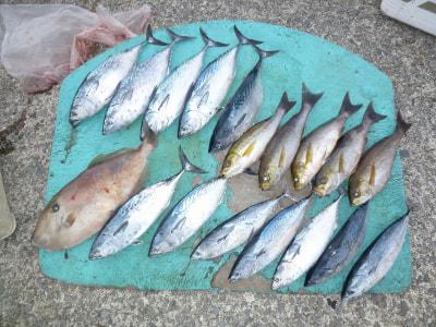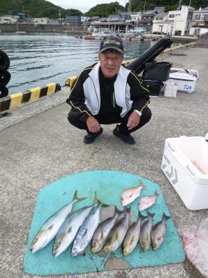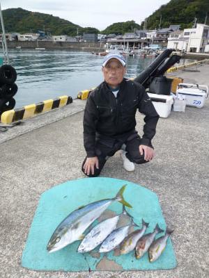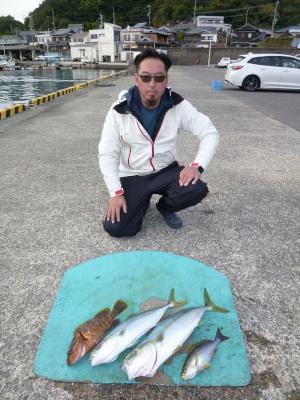 沖一文字内、ヤイト、7本、〜36cm、平ソーダ、5本、〜35cm、イサギ、5枚、ウスバハゲ、1枚、かご釣り