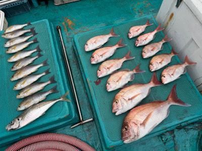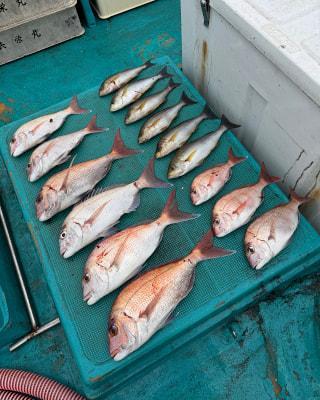 コメント:別船 オキアミ五目 マダイ、青物狙いで出船❗️🎣 船中 良型マダイ、マダイ38匹❗️他、イサギ、ジャンボヒラアジ、青物ヤイトカツオなど… あたり多く楽しめ🎶 良型マダイ 全員安打!✨ 良いお土産になりました👍😊 明日も出船予定しております。 乗り合い募集中! 乗船ご希望のお客様 お問い合わせお待ちしておりますm(__)m