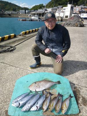 沖一文字内、ヤイト、1本、丸ソーダ、3本、イサギ、5枚、かご釣り