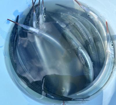 コメント:開園時、波風共に穏やかです。 夜明けからオキアミ餌のダンゴ釣りでチヌ釣れていました。48cmの良型でした。フカセ釣りでもチヌ、キビレが釣れています。手のひらサイズのチヌはあまり釣れていないようです。サビキはカタクチイワシが一時連掛けもありましたが時合いは短いようです。その他、サバ、サッパ、アジが少し釣れています。大人気のアジは今朝はよくなかったです。また夕方に期待します。 11時現在、サヨリがポツポツと釣れています。32pのサンマサイズのサヨリが釣れていました。 午後1時半現在、北西の風1.0m、晴れ、気温20℃。波風共に穏やか。 今日の午後はサビキでカタクチイワシ、サッパが少し釣れていましたが数は少なめです。サバは沖に出たのか数は減っています。サヨリはサイズかなり大きくなってきたものもいますね。