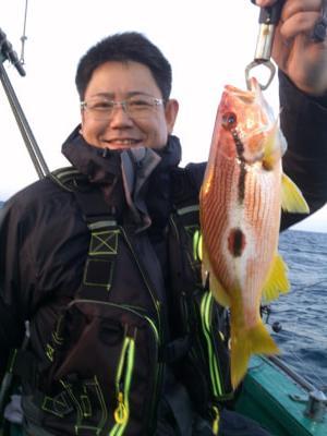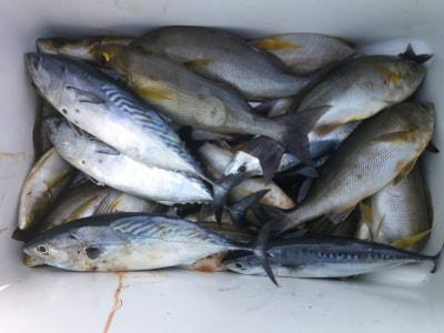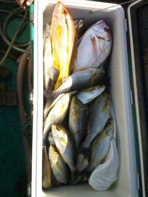 コメント:後半は型も良くて楽しめました。大変よく頑張ってくれました。色々釣れて本当に良かったですね♪イサギもこれだけあればお刺身以外にも色んなお料理にして楽しめると思いますので、手間でなければ揚げ物等も楽しんで下さいね。握り寿司にしても美味しいお魚が多いですし、もっと簡単に手巻き寿司にしてオリジナル寿司を楽しむのも楽しいと思います。タルミもお早めに楽しんで下さいね。あ、ヤイトガツオもメッチャ美味しいですので、是非とも超新鮮な内にお刺身で楽しんで頂けると嬉しいです。しかし、これだけあれば何から楽しむかで色々と迷ってしまいそうですよね。明日はお昼からシンプルにお刺身定食にして新米と一緒にガッツリ食べるのもお勧めですよ。お米と白身のお刺身は相性がとても良いですので、ちょっと多めに造ってもペロっと食べてしまいますよ(笑)お嫌いでなければご飯に胡麻を振り掛けながら食べてもメッチャ美味しいです。さて、今日は新鮮過ぎて身が崩れてしまいますので加熱料理は我慢して頂かねばなりませんが、お刺身をガッツリ楽しんだ後は煮付けや揚げ物も楽しんで頂けると嬉しいです。その美味しい御馳走の為にも、今日は後もう少しだけ頑張って下処理をして下さい。お腹の中を綺麗にしてからしっかりと水分を拭き取ってからお腹の中にキッチンペーパーを入れておいて頂ければ余計な水分を吸ってくれます。更にキッチンペーパーで包んでからラップをして、保存袋に入れて空気を抜いてチャックをして頂ければ完璧です!特にチダイは水分が多いですので、少し多めにキッチンペーパーを使って頂くと良いと思います。チダイは水分を抜いた方が美味しいですので、お刺身で食べる場合は、斜めにしたまな板の上で塩を振って水分を抜いた方が美味しく頂けますよ。今日は食べないのであればきずしにしたり昆布に挟んでおけば昆布締めになりますので明日の御馳走にすると良いと思います。イサギもきずしにしても美味しいですよ。それか、お刺身を食べながら簡単に味変を楽しむ程度で良いのなら、お好みのお酢を少しお皿に入れておいて一口分のお刺身を2〜3分お酢に漬けておけば、なんちゃってきずしが簡単に楽しめます。漬け過ぎると酸っぱくなり過ぎるので、うっすら白くなる程度が良いと思います。因みに、チダイのお刺身もこの方法で食べても美味しく頂けますよ。後はわさび醤油の他に大根おろしとポン酢を用意しておくのもお勧めですね。わさび醤油、お酢、大根おろし+ポン酢の三種類があれば同じお刺身でも味変をしながら楽しめますので、思っている以上にガッツリ食べられますよ。これだけあれば王道のお料理以外にも色々と使えますので、是非とも色んな味を楽しんで頂けると嬉しいです。どうぞ、豪華で楽しい食卓にして良き時間をお過ごし下さいませ。