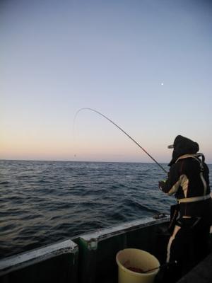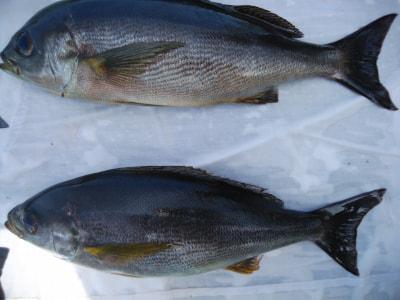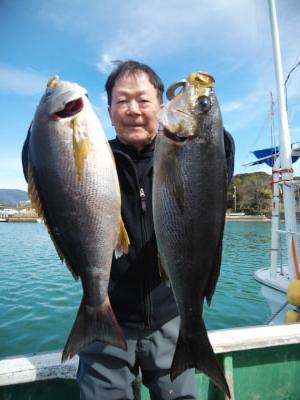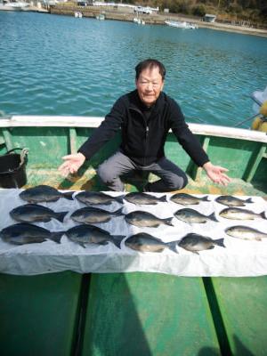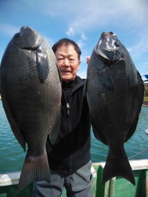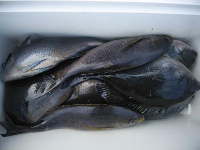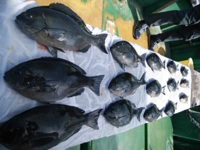 コメント:磯釣りスタイルのフカセ釣り。白浜沖でグレ釣りするなら大瀬丸へ。午前便の釣行です。北の風でゆっくりとした下り潮でした。潮がゆっくりなので針ハズレが目立ちましたが 後半、潮がよくなり寒グレ38cm頭に25枚と良型イサギ3匹交って喜んでくれてよかったです。ありがとうございました。またお願いします。