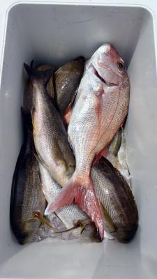 コメント: イサギ釣りで出船しています。前半上り潮が早くやや苦戦しましたが後半潮止まり何とかお土産になりました。良型のトビハタ、マダイ45センチ イサギは30〜38センチサイズでした。ウメイロも混ぜりました。連日ガラ空きで出船しています。ゴールデンウィークもガラ空きですので是非おこし下さい。